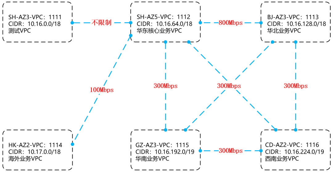企业 A 上海地域当前是两个 VPC,一个是业务 VPC,另外一个是用于测试的 VPC,同地域两个 VPC 之间理论上不限制带宽,除非底层数据中心的 DCI 互联带宽(DCI 互联带宽都是上 T 级别)被打满才会导致同地域对等连接丢包;