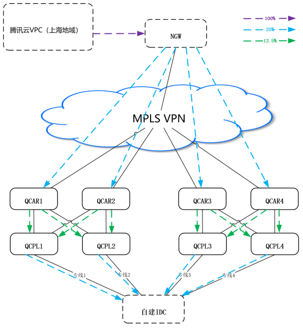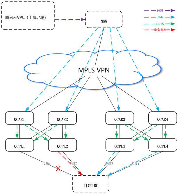 名词解释:NGW(底层专线网关集群)、QCAR(网络设备)、QCPL(网络设备)IDC(数据中心)。