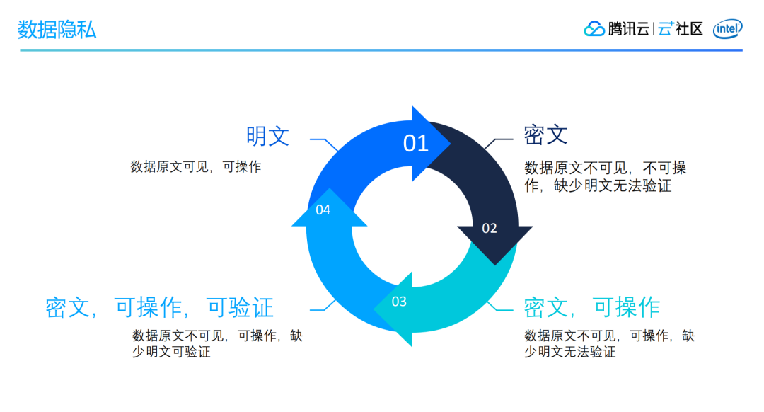 如果明文上链不可行,还可以选择密文上链。数据的原文参与方是看不到的,而且它是不可操作的,并且缺少明文和对应的私钥也是无法验证的。密文上链的典型场景是存证,哈希存证就是密文上链。当然也可以用对称、非对称的方法加密上链。