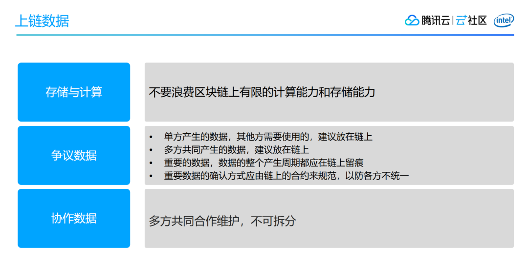 另外对于有争议数据,比如是你单方产生的数据,但是其他方要使用,这时候建议上链;还有多方共同产生的数据,也建议放在链上;对于重要的数据,数据的整个生命周期都应在链上留痕;第三个是多方共同维护的不可拆分的数据也建议上链。