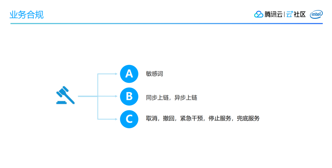 在业务合规层,明文上链会导致一些敏感词在链上。因为区块链的不可篡改,虽然可以在后续的区块里面增加新的数据,但是它不可以修改原来的数据,这个敏感词就永远留在链上。我们建议:在做业务的过程中要考虑敏感词过滤处理。