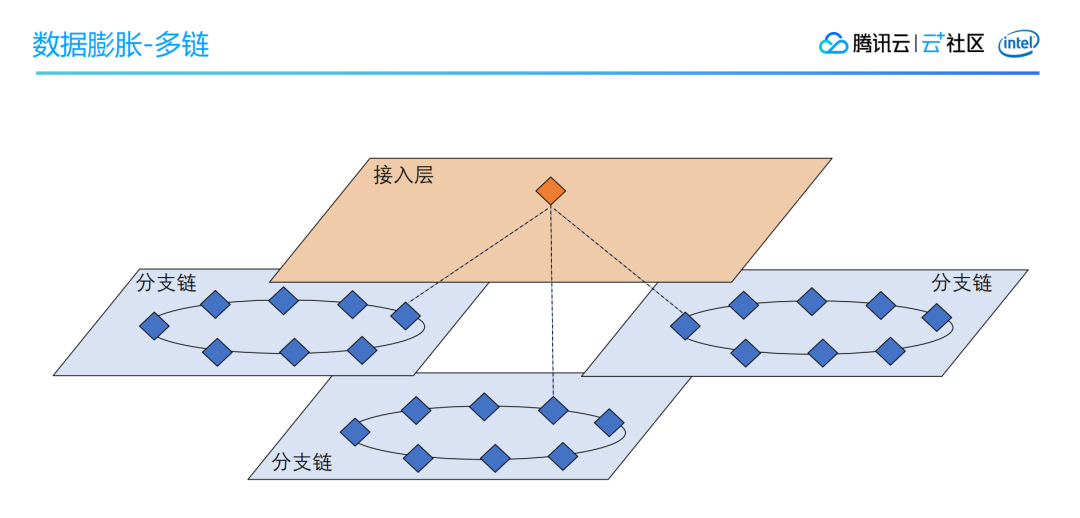 比如存证应用,特定的存证放在不同的链上,底层可以有多条链,通过底层多链的结构解决单链膨胀的问题。