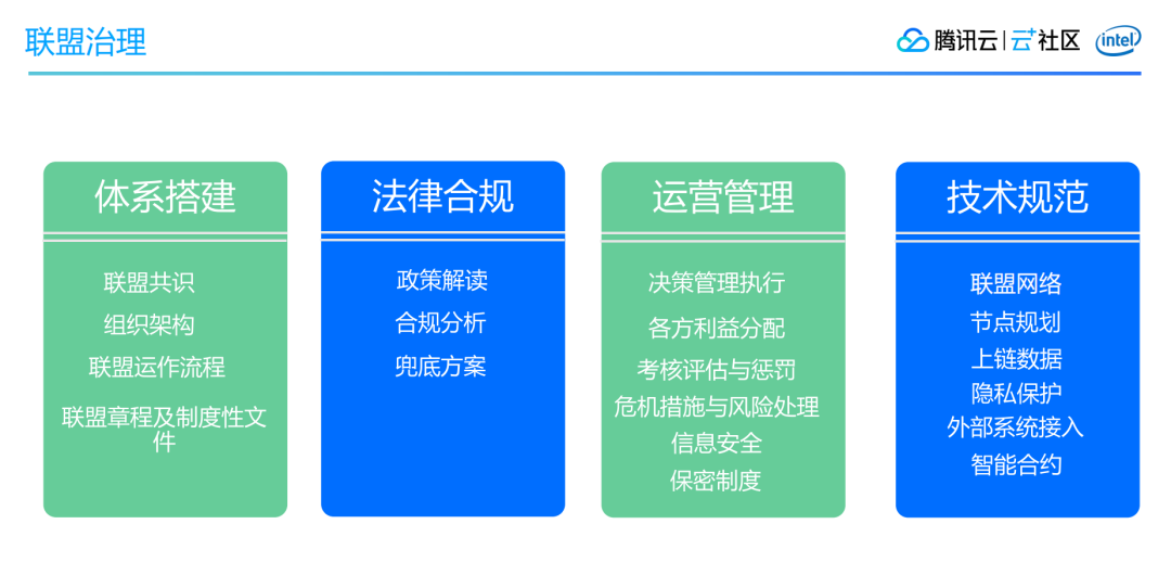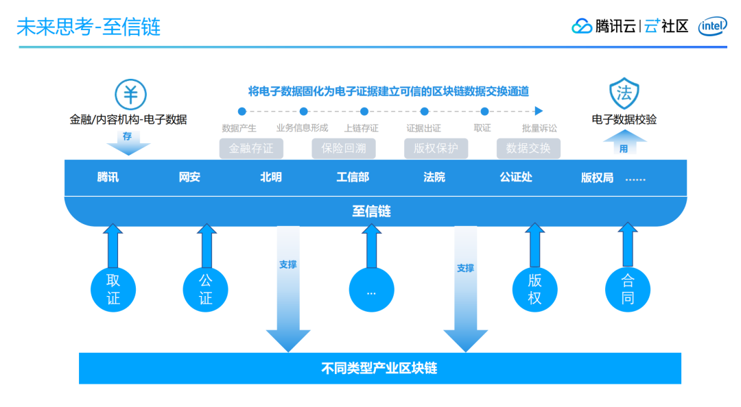最后来跟大家介绍一下腾讯云联盟链治理的历程。我们在最开始搭建至信链的时候是跟网安、北明和司法机构一起合作。合作首先要达成一个共识,这个共识就是:我们到底要用区块链做什么。最后达成了统一的共识:从可信电子存证开始。