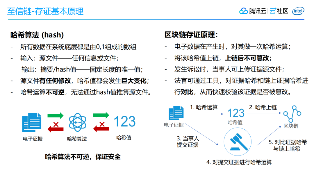 在至信链中,我们主要是用区块链来做存证。当用户产生数据以后,用户对数据进行哈希处理,然后存储在至信链上。哈希可以保证一个文件到哈希值是一对一的关系,而且很难从哈希值再反推回原文件,如果对原文件做任何修改也都会导致哈希值发生巨大变化。