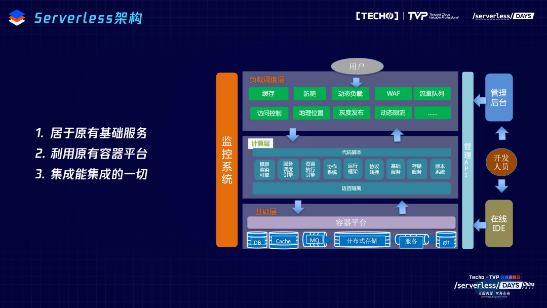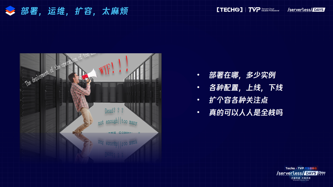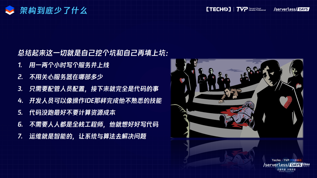 总结一下,第一个是我们可不可能用一两个小时写个服务并上线?为什么不能呢?因为受制于开发过程,或受制于服务基础设施对开发过程的支持问题。第二个是研发是否需要关注每个服务器?代码同学可能不愿意想,但整个轮子是自己造的,一系列的事情都要被考虑,在DevOps里是一个很大的问题。因为这两点,整个需求的前置条件就越来越多。再下来,开发人员可以像操作IDE那样完成他不熟悉的技能吗?如果一直用同一种编程语言可能没问题,但如果没有很好的培训体系,或没有单一的技术架构体系下,这也是一个麻烦点,我们真的有那么多全栈工程师吗?接着是运维智能化,今天我们看到的运维都是人在运维,是真的“人工”智能。这些加起来,尤其是第一第二点,是我们最大的“坑点”所在。