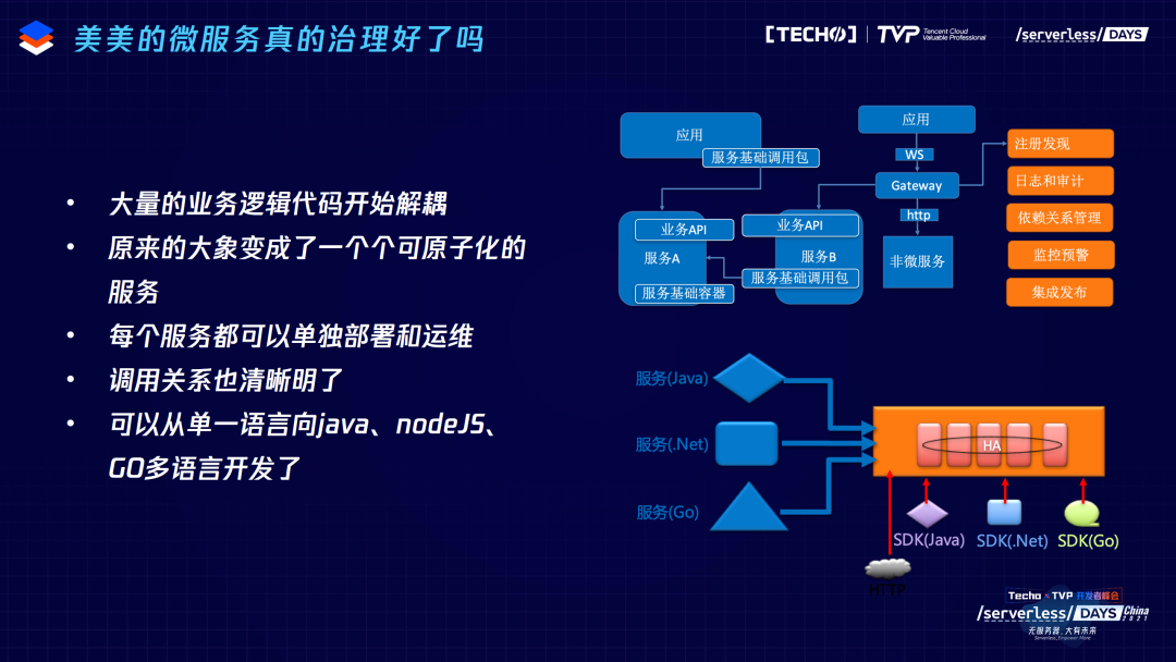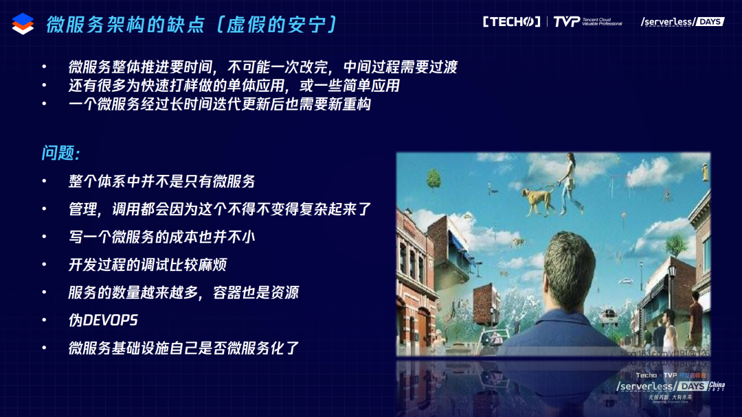 微服务带来的是虚假的繁荣景象,链路、扩容都有问题,其实在真实业务情况下,扩容从来不是因为某一个服务器,或者某一个部署不够,拉起不够,最大的问题永远来自于链路无法更新、链路上有很多单节点问题,或者有些点就是无法扩容的。再好的微服务与基础设施一样无法扩容。这样的麻烦点带来一个问题,在现有的微服务体系或单体体系,如何更高速地让你的应用成长、业务变现更快?这个情况下,我们的架构到底出了什么样的问题,所以导致我们现在不管怎么做,都快不起来?