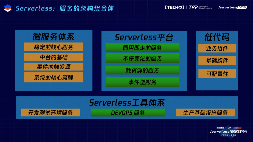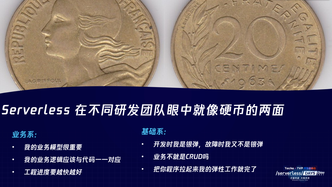 这件事情在 Serverless 角度也是这个状态。在 Serverless 眼中,就是硬币的两个面,如果我们把基础研发和业务系的研发看成两个面,代表了不同的角度。我们先来看基础系的同学,今天很多 Serverless 框架或者 Serverless 工具都是基于相同的理念做出来的,大量的工程师是基础架构研发团队出身,我也是这样,三年前一直在从事基础架构,从基础架构程序员到架构师再到CTO,所以在基础架构同学眼里,永恒的一件事情是什么?我做的这个东西在没有出问题的时候,在向别人介绍的时候,都是银弹,你用我的能解决所有问题,包治百病!等到故障出现的时候就说你们用错了,我不是银弹!从基础架构同学眼里看业务同学,永远是CRUD,“云程序弹性工作我已经完成了,不是可以快速拉起吗?”如果转化到业务的视角,个人经历来说,正好这三年我做业务去了,我刚到业务团队时想:这不是很简单吗?指挥几百个基础架构的人都这么轻松,指挥上千个业务同学更简单。其实不是这样的,业务更注重的是模型。业务模型的变化带来程序的变化,也就是,让自己试图变成运营和产品。再下来业务逻辑代码是不是一定的?如果找不到对应代码,未来维护非常麻烦,某个业务点的改动一定会针对代码,中间出现断层就麻烦了。工程进度也越快越好,因为所有人都催你赶紧上线。一条 SQL 到一个服务的距离到底有多远?一个代码脚本能不能就是一个微服务?如果重构是天性,能不能让重构变得廉价?今天 Serverless 就在完成这几件事,更轻地做服务,让重构变得更廉价。