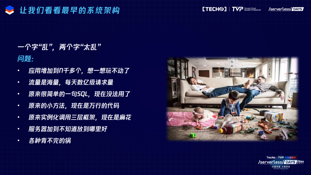 回到原点,最早的时候应用怎么做?其实很简单,只需应用+数据库,最多在数据库上再放点缓存,运维也很简单,只需要看生死。但随着坑越挖越大,业务需求越来越多,系统规模越来越大,麻烦出现了。最早我们把前后拆开来,把一些服务单独部署出来,服务化、总线开始出现,这个时候架构本身意义上来说,它并没有大的变化,只是把原来完整的整体切分出多个个体。这个情况很多新的程序员还没有切身感受——什么是单体应用?现在的其实跟当年真正的单体应用差很多,我毕业时,一个单体运转起来上百G的内存就没了,非常依赖CPU的性能,成千上万的应用卡在代码里,根本分不清。但是到我们服务化之后,又出现问题,简单的服务化可能带来的是什么?更多的被部署,调用了无序,各种麻烦出来了,我们的问题是看到这么一张图(见下图),我们的运维、架构师看到所有应用的时候,就像看到那几个小孩把东西弄得杂乱无章,为什么?因为应用从1到10很简单,但拆成上万个应用的时候,可以想象刚才那种模式的大缺点是互相没有关系、不知道互相做了什么,这就带来大量重复的劳动,然后链路上到底哪一块是我们真正的压力?再下来,原来很简单的一句SQL,是否现在没法用了?一系列的问题带来了刚才架构的凌乱。