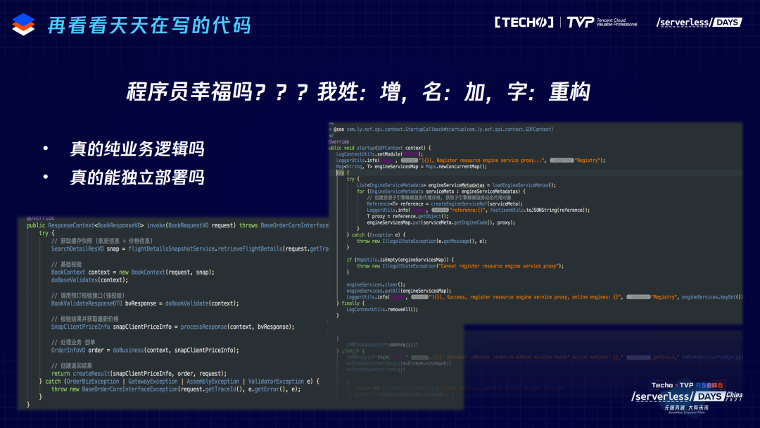 那我们程序员真的幸福吗?其实很多情况下,我们程序员叫重构,每个程序员在工作时,听到最多的一句话就是我们需要再迭代一下,迭代一下就是代码需要重做一下,或者重写了。为什么会出现这样的问题?因为我们的业务逻辑不够纯粹,或者业务逻辑纯粹之后独立部署的比较少,都是互相关联的状态。当业务逻辑不够独立或者设计不太完美的情况下,我们试图做成完美服务体系的时候,一个业务点发生变化会带来一系列变化,导致的问题是大量重构和重写。我想在这里引出 Serverless 的一个点,既然我们避免不了重构,也避免不了业务变化,业务确实一直在变化,重构一直在发生,不如让我们更加开心地、更爽地去重构、去变化。既然我们的代码用了一段时间一定会变成没用的,那就让它自然死亡,不要变成僵尸,这也是触发我们去做 Serverless 的一个点,让我们代码转换速度变得更快,让我们废弃代码或者重新做成代码成本越来越低,我重新做它的时候并没有让整个工程都去重构,这样的事情实现的时候,也让我们的代码业务逻辑片断不停地被重新迭代。