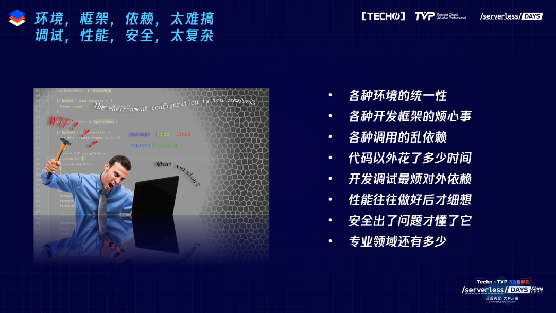 剩下的就是刚才说的各种环境依赖,这也是我们做 Serverless 很大的点。整个环境依赖状态下,我们一直忽略了生产中一个很大的问题——整个开发过程。这件事情其实被我们所有架构师忽略,或者大部分技术分享的时候也很少提及。大部分时间下,我们一直在集中生产,怎么让生产更稳定,怎么做故障的转移、自愈,怎么做弹性、扩容,却很少想到我们怎么更舒服地开发、写代码。因为任何一个架构做出来,一定要从写代码、调试、测试开始,但我们回头看看今天的开发测试过程,如果把整个框架的可扩展性、整个架构可扩展性排除外,今天开发过程是不如单体状态下的,因为太麻烦了。本来我自己本地就可以跑起来的代码不得不依赖一个开发环境,本来很容易做的测试的状态不得不依赖测试环境,而测试环境又互相依赖和冲突,以至于测试没有办法真正把环境更好地测试。如果把这些都隔离出来,每个程序员、每个开发、每个测试都有完整独立的环境,可以解决这个环境,但是可以想象这个成本会有多大,而且要保证这个环境的代码是同步的?