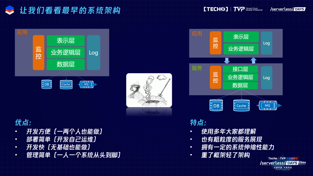 带着这些问题我们再去想用 Serverless 做什么?来看架构设计的过程,其实架构设计的过程本身,我认为就是一个填坑与挖坑的过程。我们觉得单体应用不好,所以从单体的坑里爬出来,去旁边挖了一个微服务的坑,用挖出的土把单体的坑填了。当我们觉得微服务很难治理的时候,在旁边挖了一个service mesh的坑,又把这些土填回微服务的坑。后来我们又觉得 Serverless 很火,于是又挖了一个坑,挖到一半突然觉得隔壁单体的坑看起来不错,因为这么多微服务拉不起来,而单体就一个,我们是不是应该回归单体呢?于是就出来这么多填坑和挖坑的故事,也正好是刚才我们提到的,我们为什么去想 Serverless?因为在填坑和挖坑背景之下就是我们要解决业务应用难题的时候,在每一个时代,整个基础设施是不一样的,所以我们在那个时代填那个时代的坑的时候,发现因为基础设施落后,我们在架构上想了很多办法;当基础设施在提高的时候,于是我们架构设计又开始回归,这是不停循环的过程。