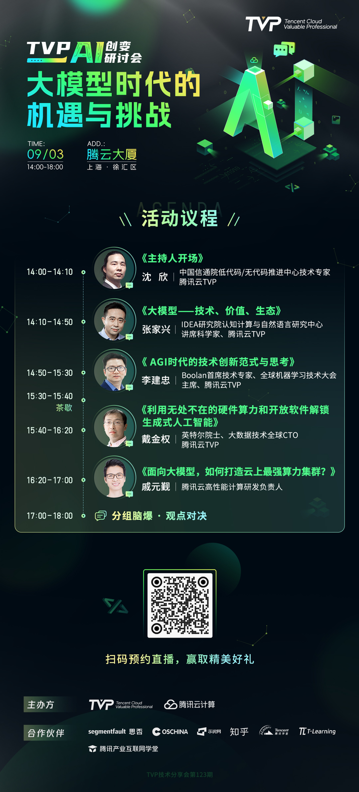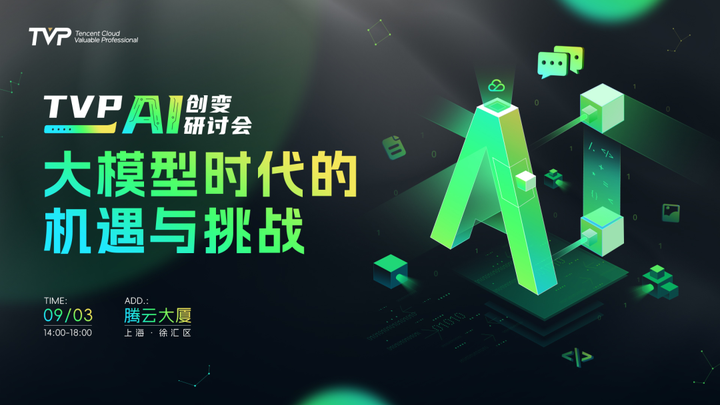 9 月 3 日(周日)下午 14:00,「大模型时代的机遇与挑战」腾讯云 TVP AI 创变研讨会将在腾讯云 TVP 视频号等多平台同步直播, 扫描「海报二维码」即可报名,快来线上和 AI 大咖一同交流吧!