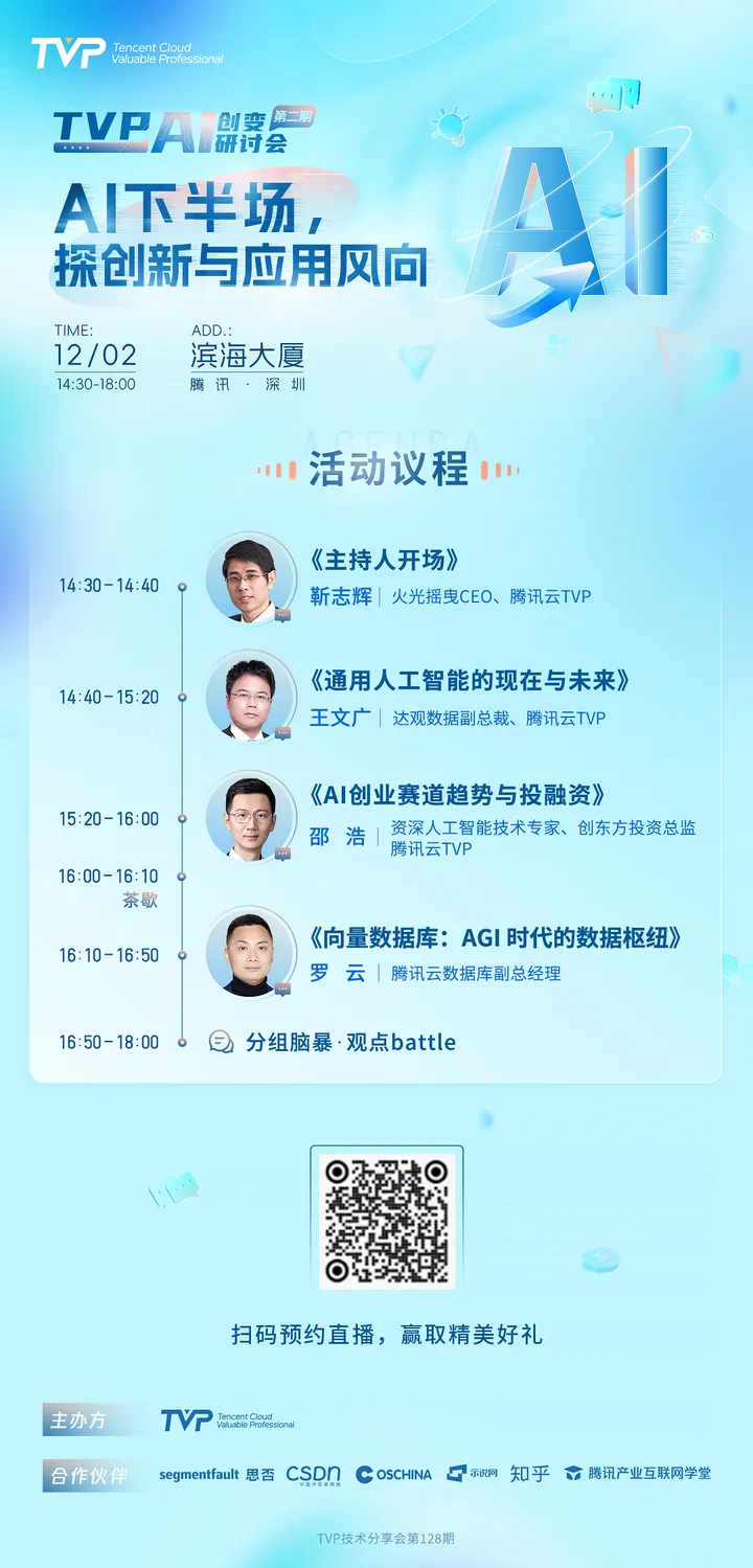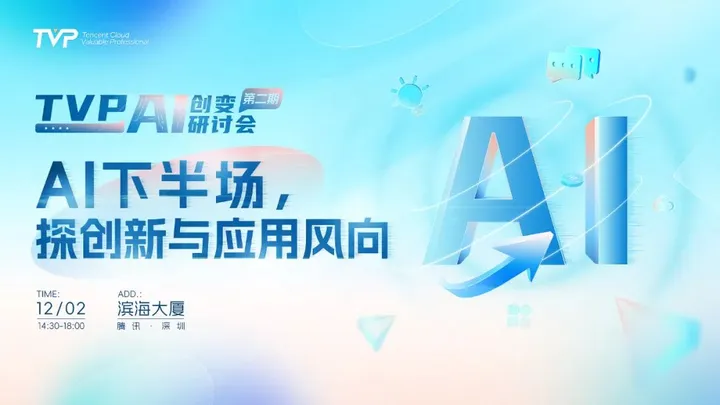 12 月 2 日(周六)下午14:30,「AI 下半场,探创新与应用风向」TVP AI 创变研讨会将在腾讯云 TVP 视频号等多平台同步直播, 扫描「海报二维码」或点击「海报下方视频号卡片」即可报名,快来线上和 AI 大咖一同交流吧!