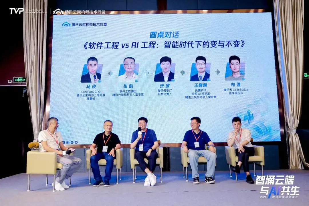 圆桌对话环节,在马俊主持下,张刚、张敏、王巍巍和腾讯云 CodeBuddy 首席架构师、腾讯云架构师名人堂专家 林强齐聚,进行《软件工程 vs AI 工程:智能时代下的变与不变》的深度对话,探讨 AI 重构一切的今天,必须坚守的软件工程根基以及将被重新定义的规则等话题。
