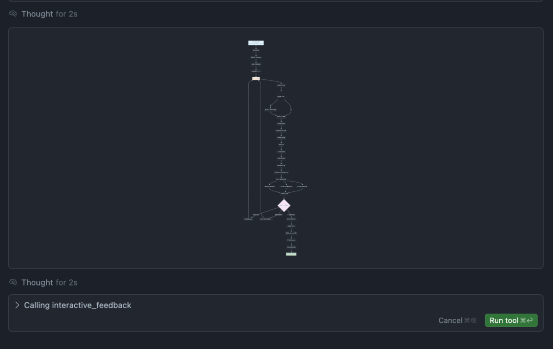完成初步拆解后,Cursor 按照 rules 要求,用 Mermaid 语法生成了流程图(值得一提的是,聊天框内直接渲染 Mermaid 图表的功能,是 Cursor 最近才更新的新特性,极大提升了逻辑展示的直观性)。随后,它自动调用 mcp-feedback-enhanced 工具弹出反馈框:“是否需要补充细节?”