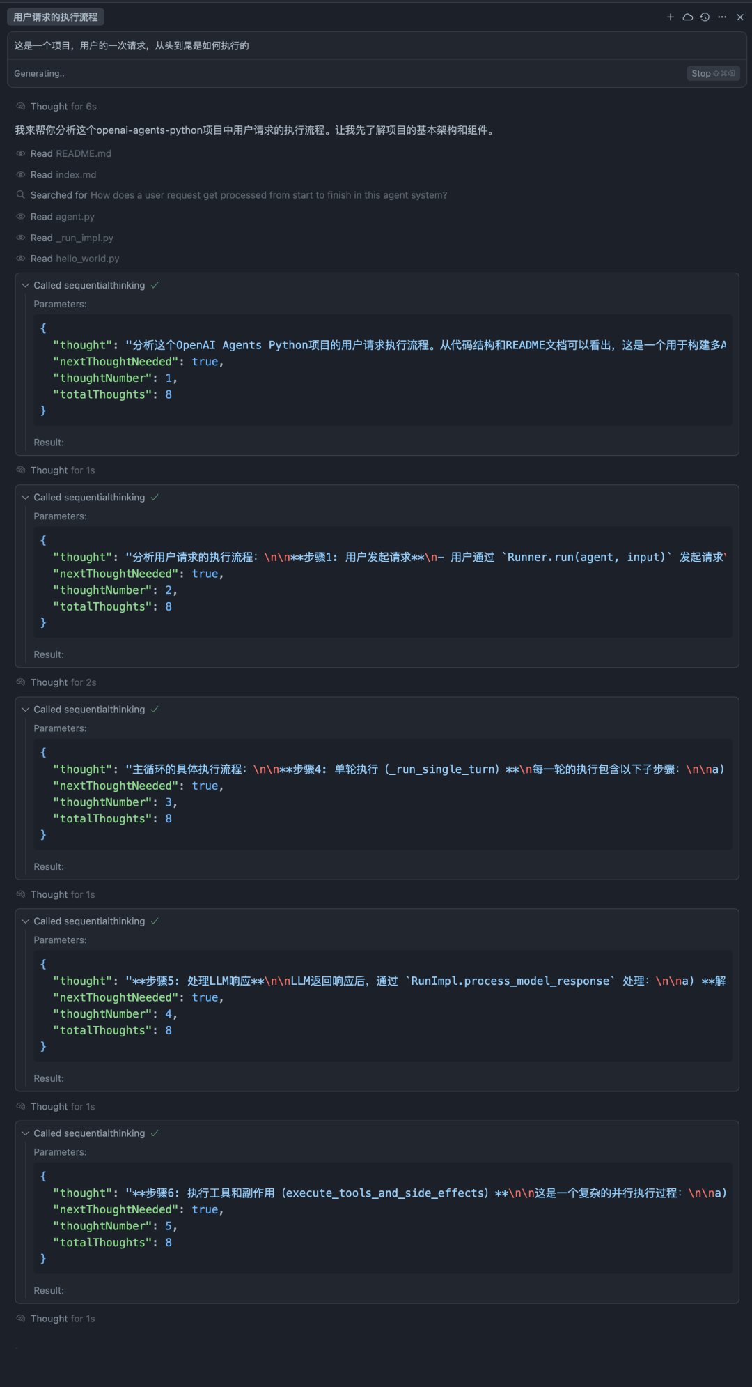 以学习 OpenAI Agent SDK 为例,我想通过一个具体场景,展示 rules 与 MCP 工具是如何配合工作的。对我而言,熟悉一个项目的核心,在于理清两个逻辑:进程启动的底层机制,以及用户请求的处理链路。于是我向 Cursor 提出需求:“分析这个项目中,用户的一次请求从发起至响应的完整执行流程”。