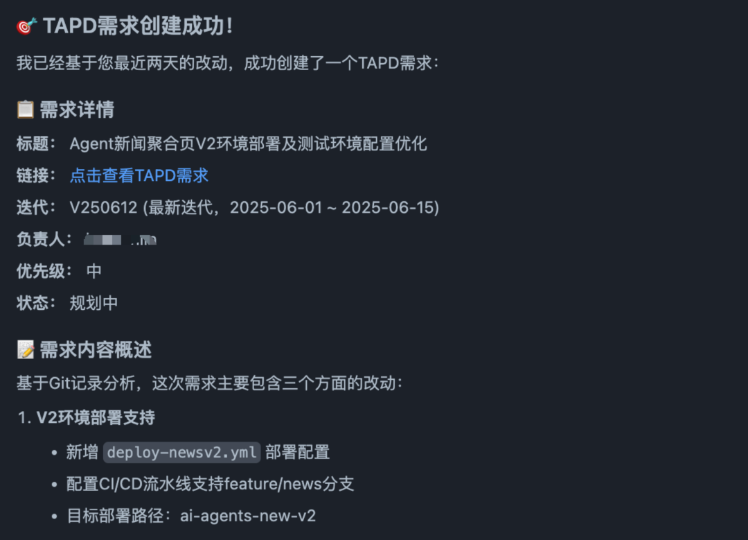 在与 Cursor 完成交互(包括需求讨论、代码修改等过程)后,只需说一句:“根据我们的交互记录及代码修改记录,帮我写个 TAPD”,Cursor 就能直接生成包含需求背景、具体执行步骤的 TAPD 单,还能自动关联指定迭代。整个过程无需重复输入固定信息,大幅提升了记录TAPD的效率。