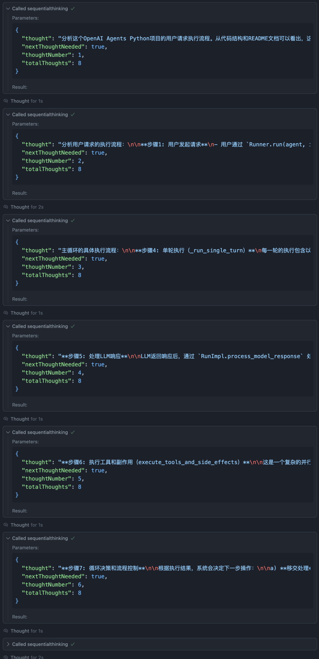 紧接着,它调用了 sequential-thinking 工具,像人类拆解问题那样分步推进: