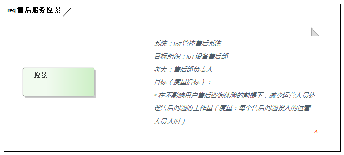 如前所说,愿景需要明确人群机构,还需要有明确清晰的目标定义。那么一个 IoT 管控业务的售后系统愿景大致如下所示:
