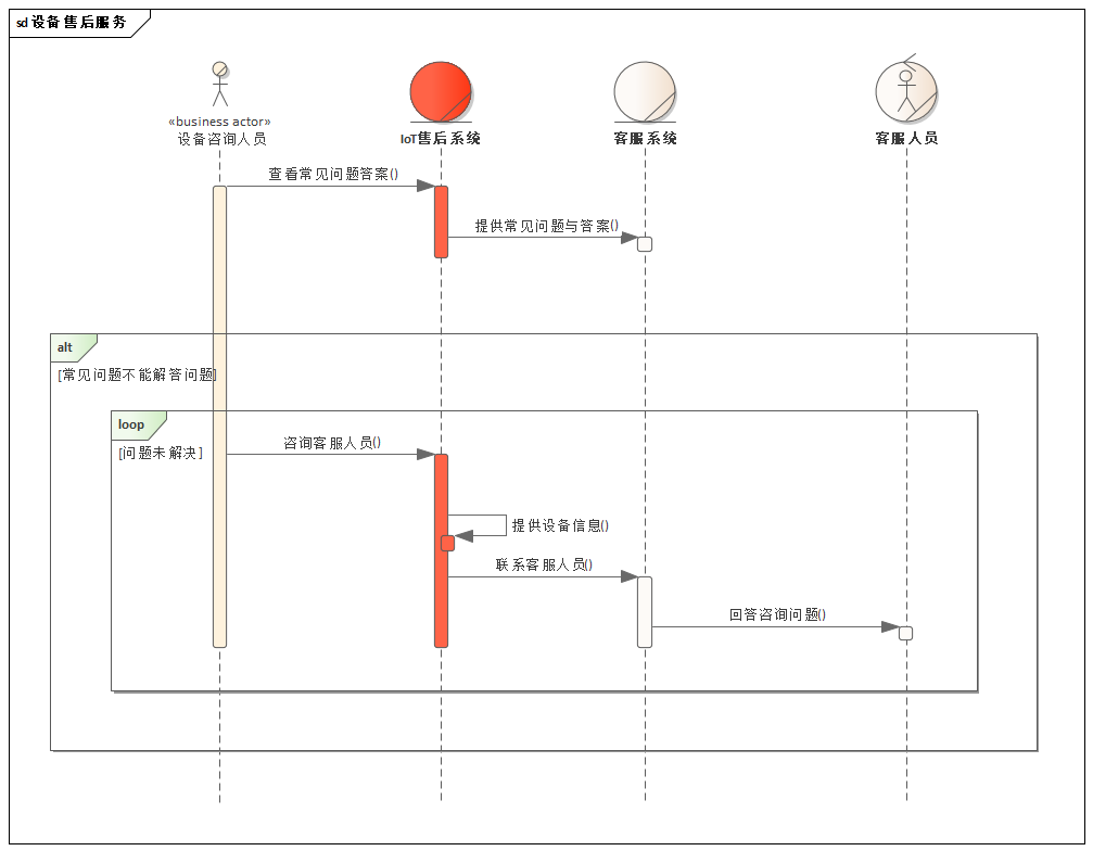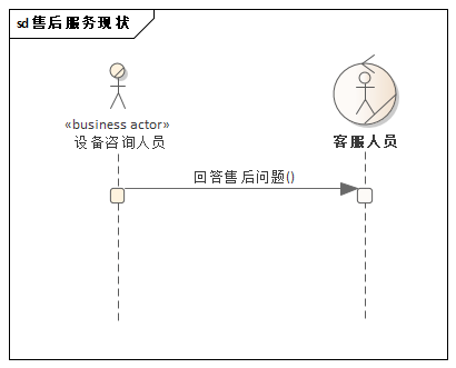 在 IoT 管控的售后服务现状序列图中,我们可以发现,售后服务的现状全部都由人力组成,其问题和解答的流动是由人来传递的。