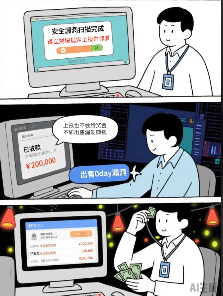 通常情况下这一招式内部程序员或者伪装成白帽的黑帽更容易实施,通过参与漏洞众测、发布安全研究报告等合法活动建立信任,暗中却将高危漏洞转售至暗网市场。