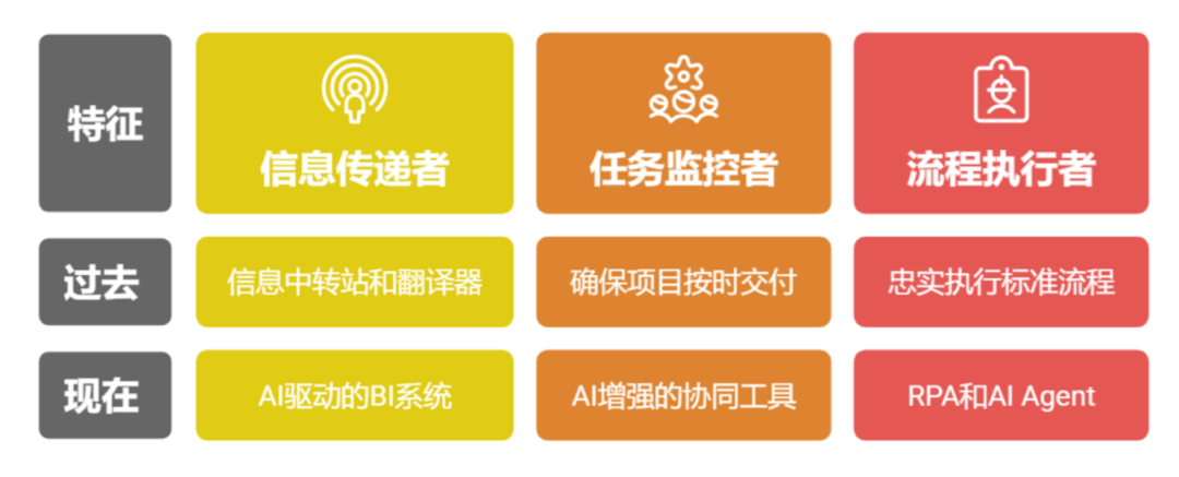 我们必须冷静地剖析,AI到底对哪一类工作更具威胁?一是信息传递者,主要工作是收集、整理、提炼信息,然后上传下达;二是任务监控者,主要负责分配任务、跟进进度、开会对齐、确保项目按时交付;三是流程执行者,是标准流程(SOP)最忠实的执行者和维护者。如果你目前的核心价值,主要集中在这三个角色上,那么,你就应该警惕了。