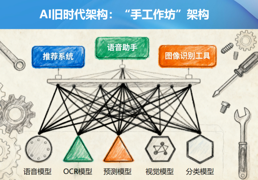 从单体应用发展到现在的云原生架构,其迭代速度是非常快的。如果我们单讲AI架构的演化,短短十几年时间,其已经经历了“手工作坊”式架构时代和目前我们正处在的“发电厂”时代。
