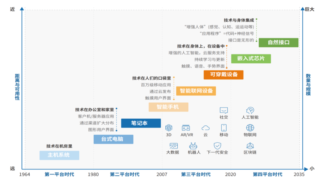 如果以2020年为界,硬件时代已进入第四平台时代,这个时代的特征是技术与身体集成,代表硬件是嵌入式芯片和自然接口。