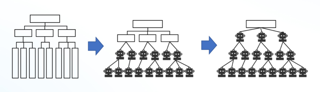 未来,随着组织的智能化演进,越来越多的工作岗位会被AI取代,越来越多的一人公司、无人工厂将会涌现,当然这是一个逐步的过程,在企业内部,这一过程将最先从基层岗位开始,然后逐渐向高层漫延。