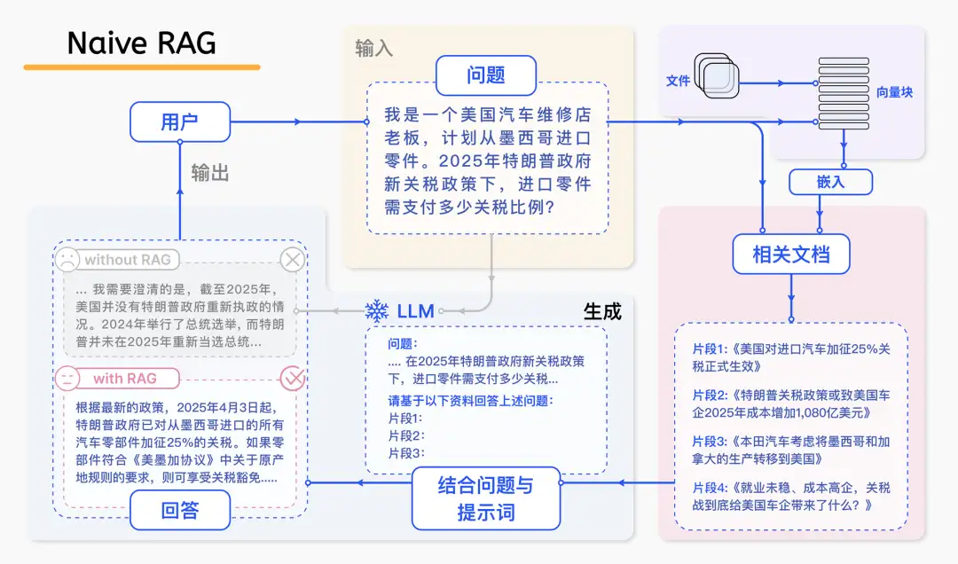 为应对这些挑战,目前的技术探索趋向于通过外挂知识库(如 RAG)来弥补大模型本身的不足。尽管 RAG 技术已从最初的基础 RAG 发展到具备自主决策能力的 Agentic RAG,但在实际应用中仍然面临挑战。即便引入了 RAG,当大模型遇到预训练数据未覆盖的最新或特定领域问题时(例如政策法规中的“关税”细节,见下图),其表现依旧可能无法令人满意。