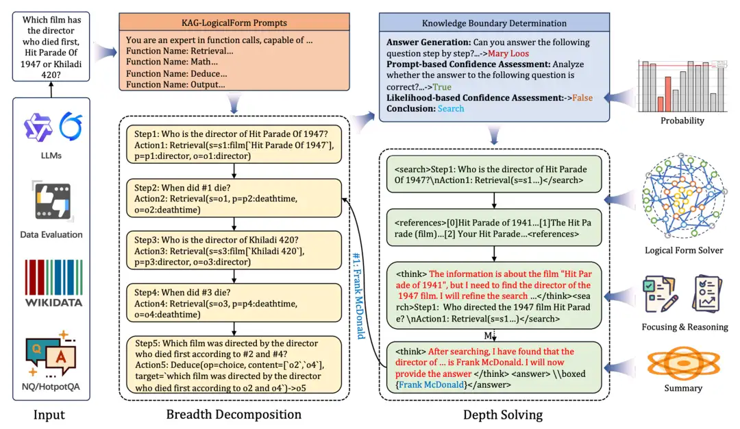KAG 技术的核心之一是如何通过逻辑符号引导的结构化推理来实现复杂问题的求解。为此,我们需要将原始问题按需分解为多个子问题,并清晰地刻画这些子问题之间的逻辑依赖关系。在此基础上,系统应能自主判断以下几项决策: