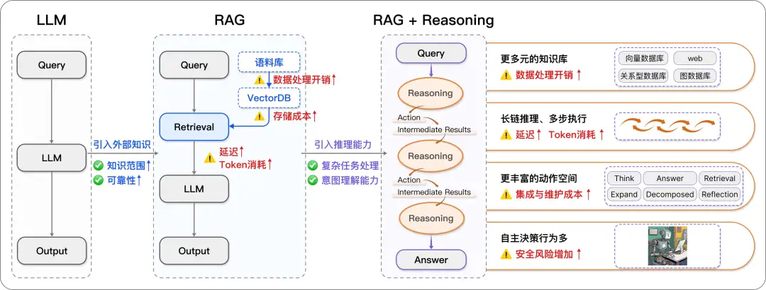 在前述讨论中,我们提到大模型通过引入外部检索和求解器调用来扩展其能力,但这种依赖在实际应用中也面临一系列挑战。随着从大模型到 RAG 的过渡,虽然引入了外部知识库,系统的存储开销、token 消耗以及授权成本等方面却显著增加。此外,尽管推理增强能够处理更复杂的任务,但整体流程耗时增加,这对实际落地应用提出了新的挑战。