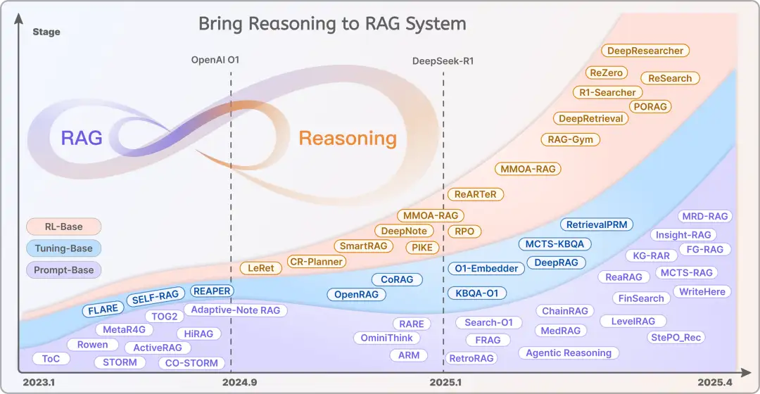 随着 OpenAI o1 和 DeepSeek-R1 等慢思考模型的兴起,RAG 与推理能力结合的研究逐渐增多,促进了 RAG 技术在垂直领域的落地和发展。在这一过程中,技术创新不仅涵盖了最轻量级的提示工程(Prompt Engineering)和微调方法(Fine Tuning),更重要的是基于强化学习(Reinforcement Learning,RL)的方法,特别是在 DeepSeek-R1 发布之后,这类方法变得愈加普及和广泛应用(例如上图橙色区域)。