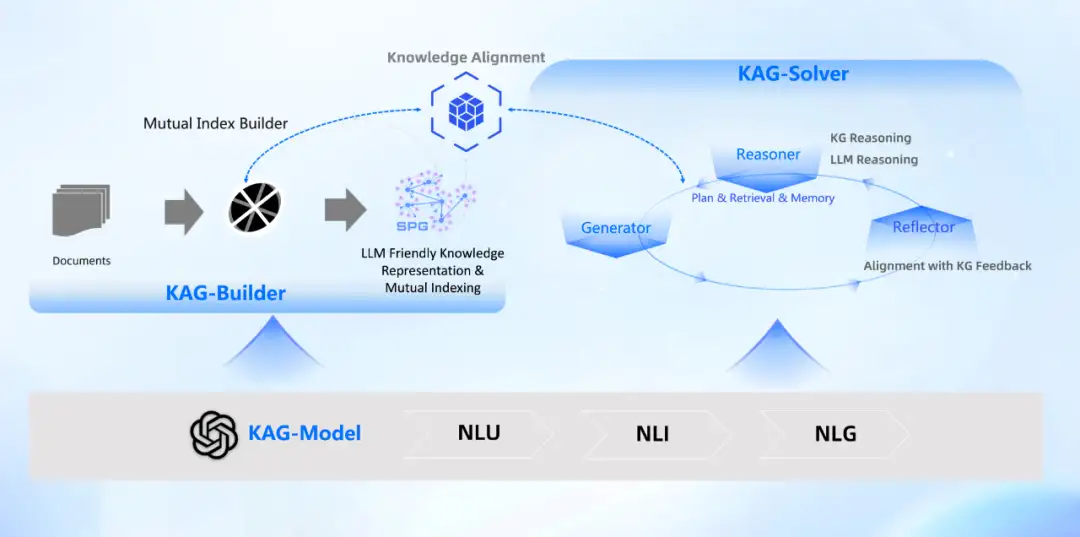 回顾前文所述的几种外挂知识库技术路线,我们可以看到现有的传统方法各自存在明显的缺陷,然而,在实际应用中,我们对系统能力提出了更高的要求。所以,我们提出了一种全新的 KAG 框架——以知识点为中心的知识索引与知识引导的复杂问题求解方案。该框架包括知识构建(Builder)、问题求解(Solver)以及底层支撑的模型(Model)三个部分,涵盖理解、生成和推理等多个阶段,能够在复杂任务中提供更为精确、可靠的解决方案。