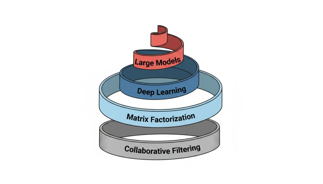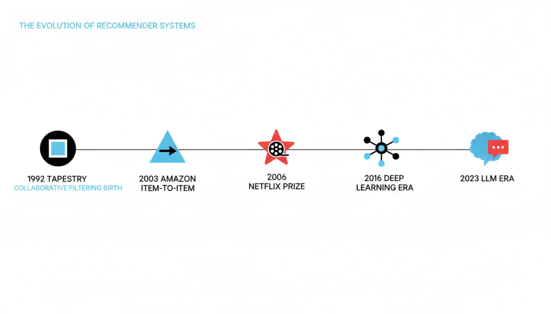 从技术演进的角度看,推荐系统走过了三十余年的发展历程,经历了几次关键的范式转移。1992年,Xerox PARC提出的Tapestry系统首次应用协同过滤算法,标志着推荐系统的诞生。此后的十余年间,协同过滤成为主流方法,GroupLens、MovieLens、亚马逊的Item-to-Item协同过滤等系统相继问世。2006年,Netflix Prize竞赛掀起了推荐算法研究的高潮,矩阵分解、集成学习等技术迅速发展,特征工程成为这一时期的关键词。2016年后,深度学习全面进入推荐系统,Wide & Deep、DeepFM、DIN等模型层出不穷,工业界形成了召回-粗排-精排-重排的标准架构,推荐系统进入成熟期。而2023年以来,大语言模型(LLM)的崛起再次改变了推荐系统的技术图景,生成式推荐、提示学习、检索增强生成等新范式正在涌现。