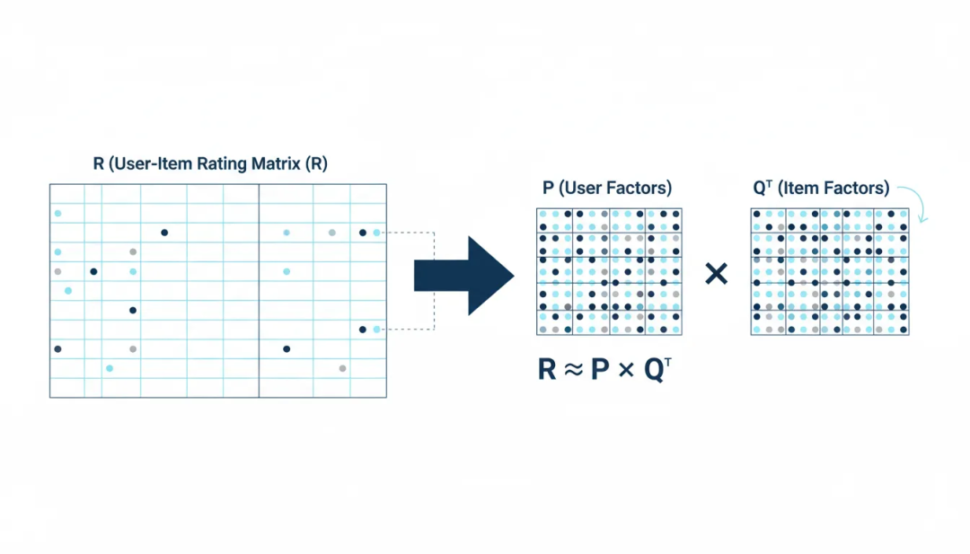 图3:矩阵分解可视化——将稀疏的用户-物品评分矩阵分解为两个稠密的低维矩阵。