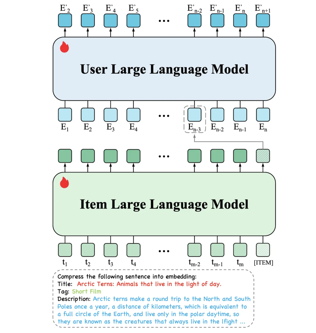 User LLM:处理Item LLM生成的嵌入序列,对用户行为建模并预测未来交互