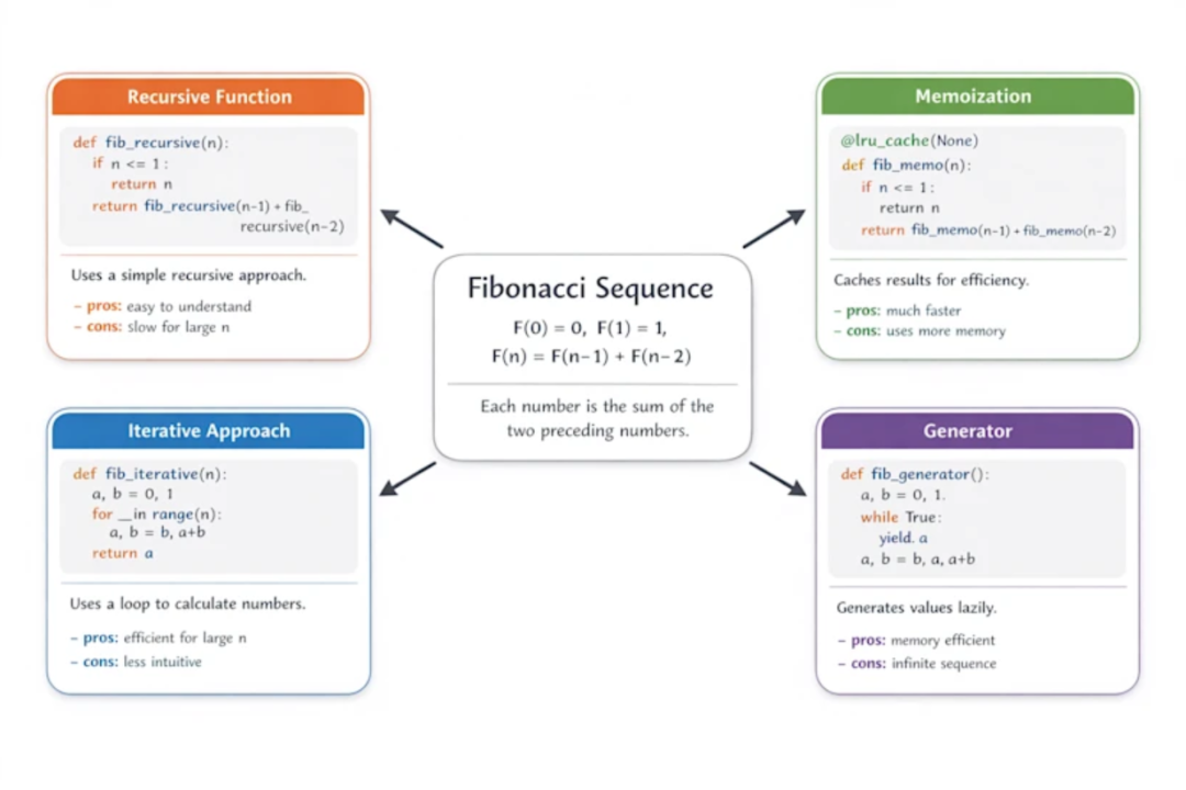 让它生成一张解析“斐波那契数列是如何工作的”: