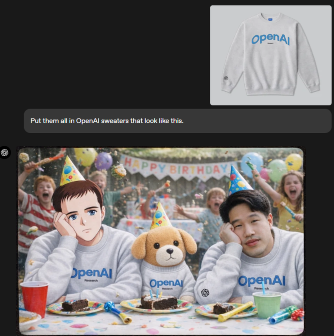 然后还可以继续在之前生成的图片之上,再添加更多的图片元素:左边那男的改成手绘复古日漫风,狗改成毛绒公仔,右边那男的和背景都别动。再让他们全部穿上OpenAI定制衣服。