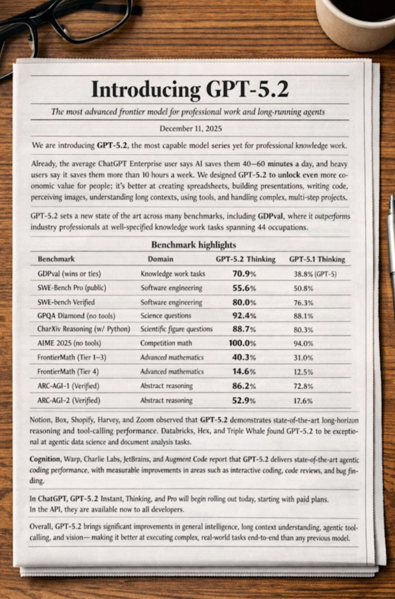 此外,模型在文本渲染方面更进一步,能够处理更密集和更小的文本。比如,让它在一张图上介绍一下GPT-5.2的内容。