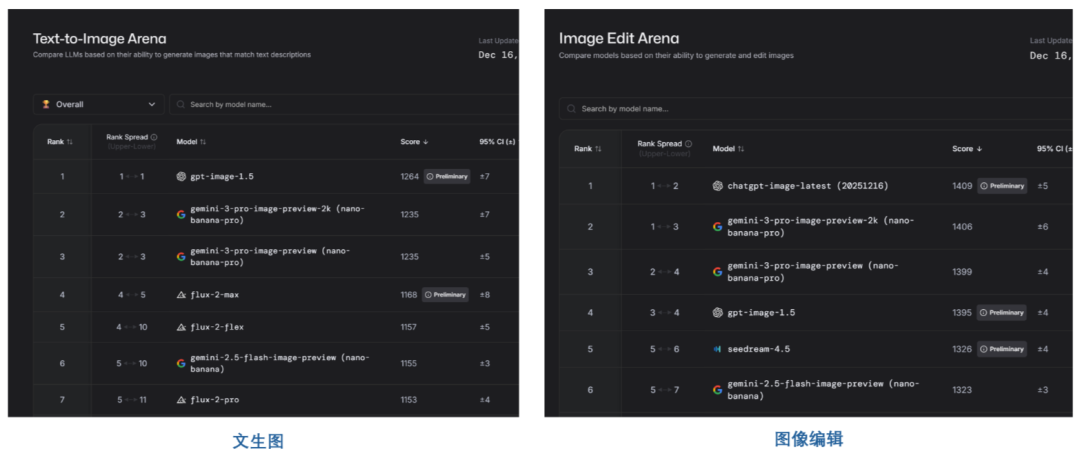 GPT-Image-1.5一经发布,就登上了各大榜单的第一名。在LMArena竞技场上,GPT-Image-1.5刷新了最新的SOTA效果。其中在文生图领域,以1264 Elo分数荣登榜首,直接超越谷歌的Nano Banana Pro等地榜首。而在图像编辑领域,chatgpt-image-latest以3分优势获得冠军,而GPT Image 1.5位列第四。
