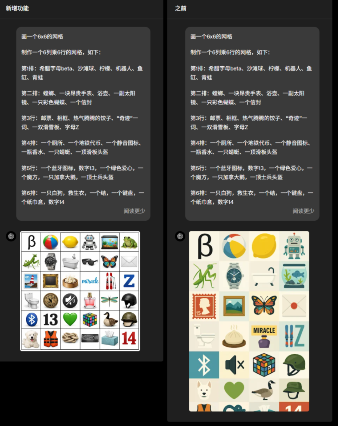 这一次,新模型在指令跟随上相比上一个版本效果会更强。比如同样让模型画出一个6*6的网格,而且网格中需要填入用户给定的信息。在最新模型的效果上生成很好,较好的遵循了指令。