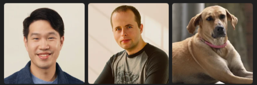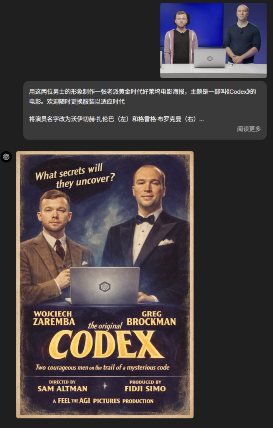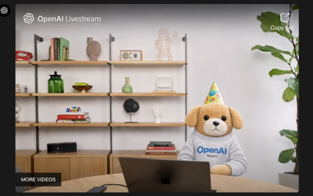 另外还可以把所有的背景进行更换,只需要一个命令就可以切换:现在把那两名男子移除,只保留那只狗,并把它放到一个类似所附图片风格的 OpenAI 直播画面中。