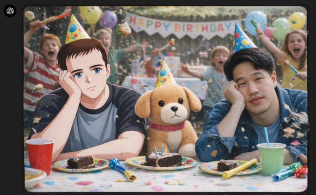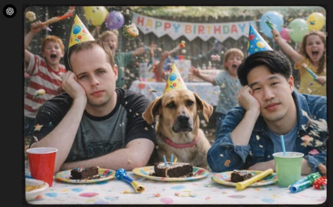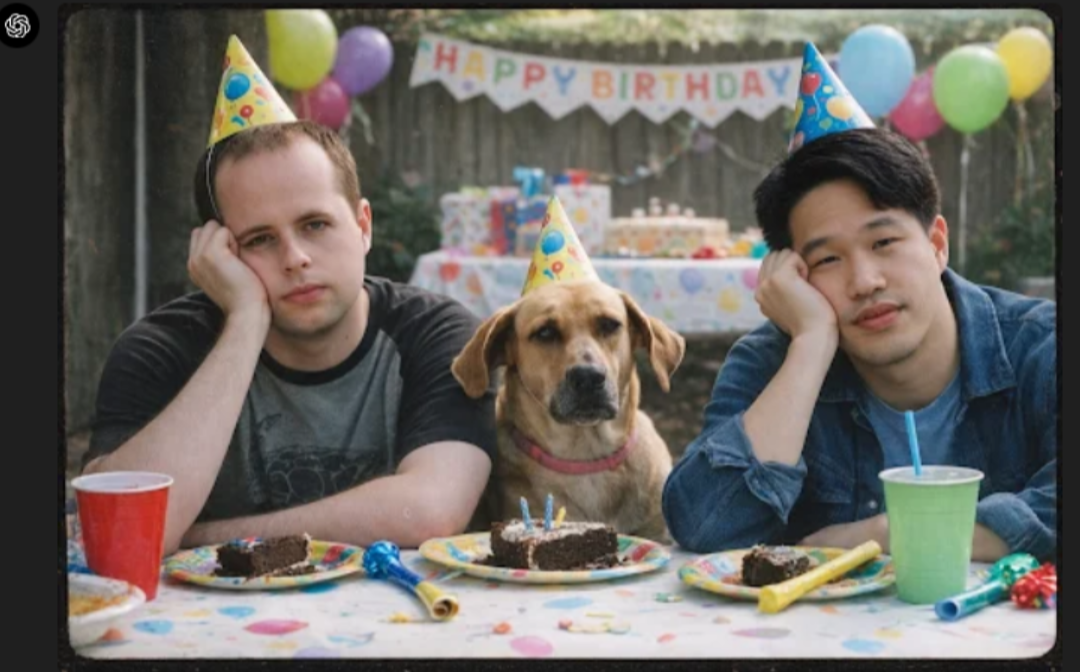 给定上面三个图片和具体的提示词:将这两名男子和那只狗合成到一张 2000 年代胶片相机风格的照片中,画面是他们在儿童生日派对上看起来百无聊赖。