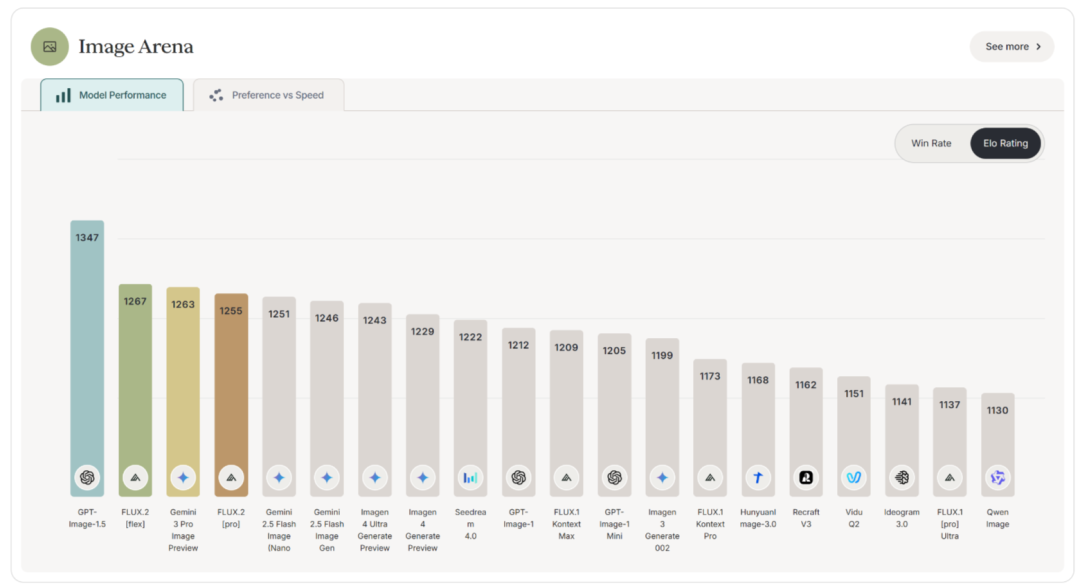 在DesignArena的图像领域榜单上,GPT-Image-1.5拿到了最高的1347分数,直接领先nano banana pro一个身位。