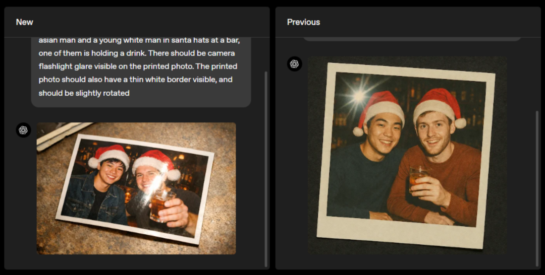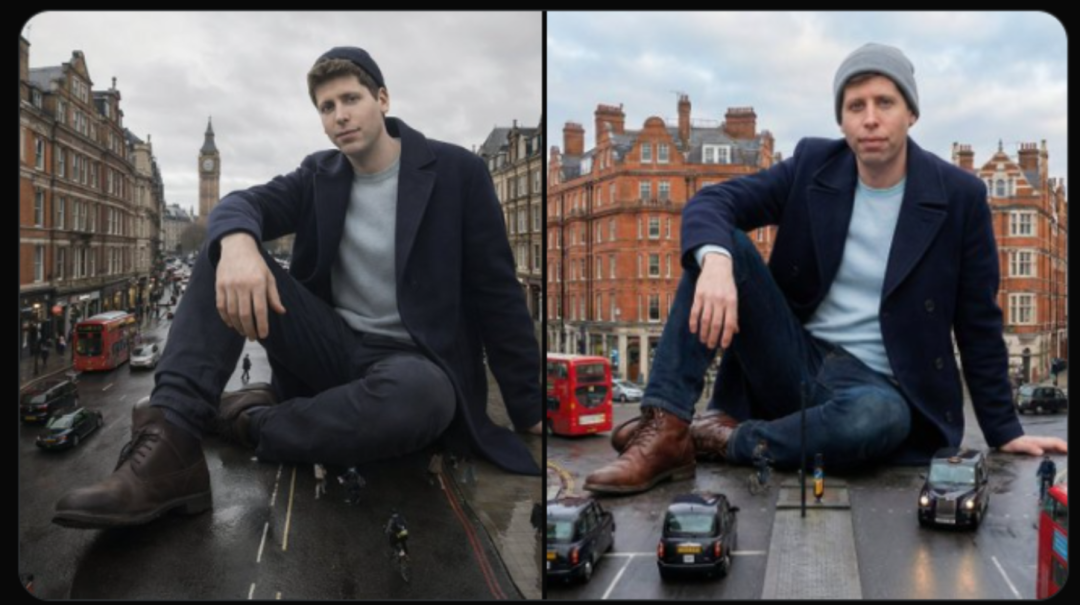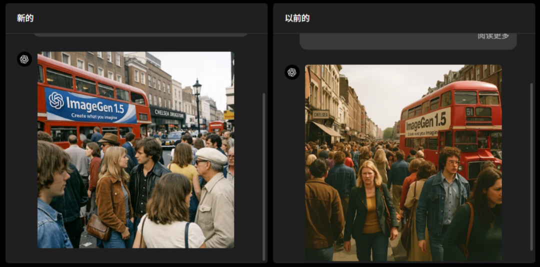 以ChatGPT Image生成1970年代伦敦场景为例,新版(左侧)与旧版(右侧)的对比图像差异尤为明显。在人脸细节处理上,1.5版本展现出更强的能力,所生成的图像更具逼真度。