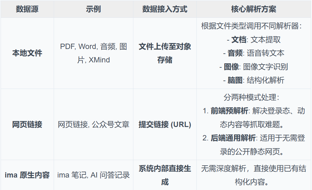 从项目立项以来,ima一直希望能够支持尽可能多的数据格式,从最初的pdf、word到如今的xmind、各类音频,ima如今已经支持了20余种不同类型的数据格式。