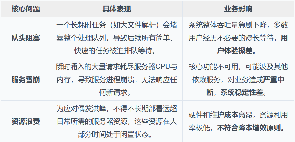当不可预测的“入库洪峰”直接冲击在刚性的“解析能力瓶颈”上时,一个简单的同步处理架构会立刻暴露出其脆弱性,并引发下表所示的一系列连锁负面反应: