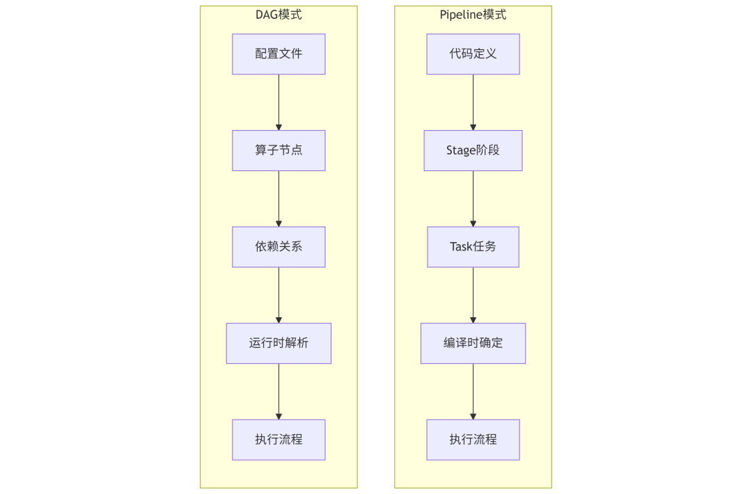 相比DAG的配置驱动,Pipeline采用代码驱动的编排方式。流程结构直接体现在代码中, IDE可直接追踪执行路径。这种显式化带来三方面价值:可读性提升,无需在多个文件间跳转; 可调试性增强,断点和日志可精确定位;可维护性改善,流程变更通过代码审查保证质量。