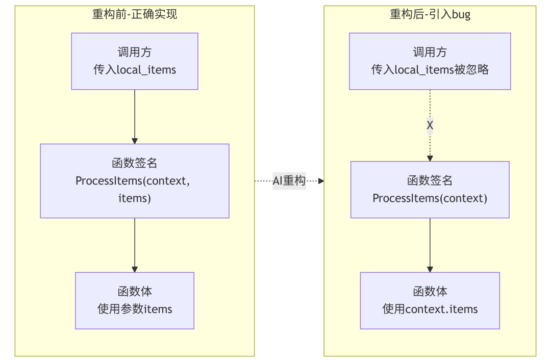 这个案例暴露了AI理解代码语义的局限性。它将函数形参视为可替换的符号, 用context中的同名成员变量进行替换,甚至自信地声称重构前后完全等价。 实际上调用方传入的局部变量被完全忽略,逻辑已经悄然改变。